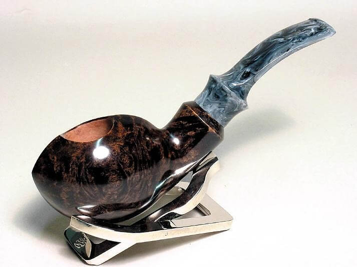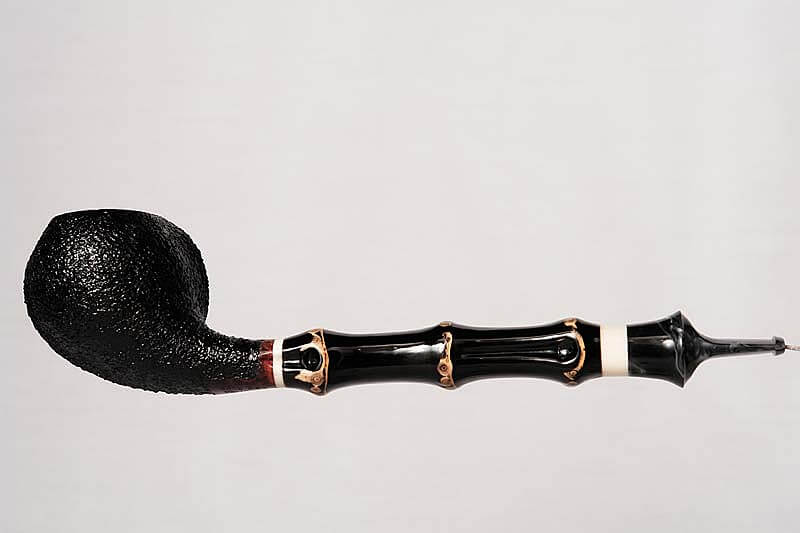 Ses tuyaux sont en ébonite, mais aussi en acrylique, qu'il colore à la main, une technique qu'il a découverte en rencontrant J.T. Cooke. Ses pipes sont lisses, à noter son rusticage si particulier.