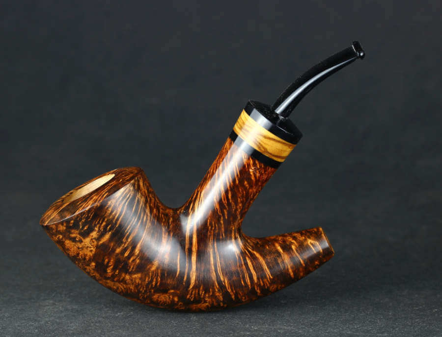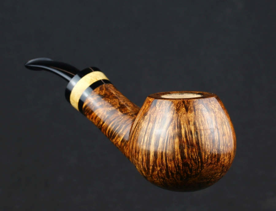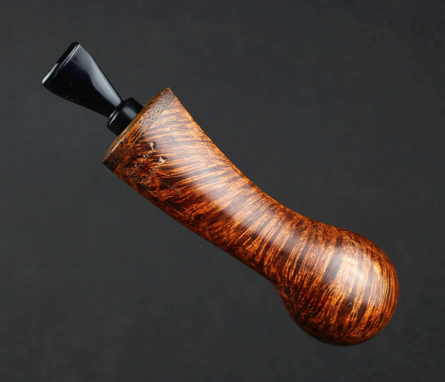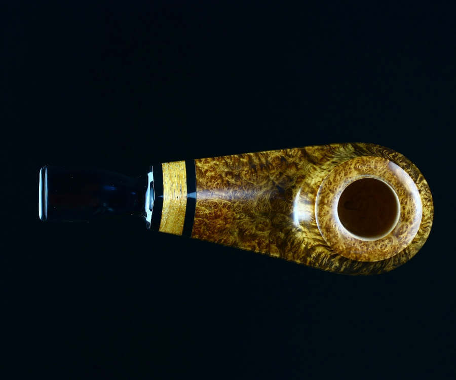 Sa bruyères vient d'Italie, et repose encore un an avant d'être taillée. Il réalise la forme à la meule, suivant le grain. Les perçages sont réalisés au tour, et le tout passe encore au ponçage final. Ses tuyaux sont en acrylique ou en cumberland.