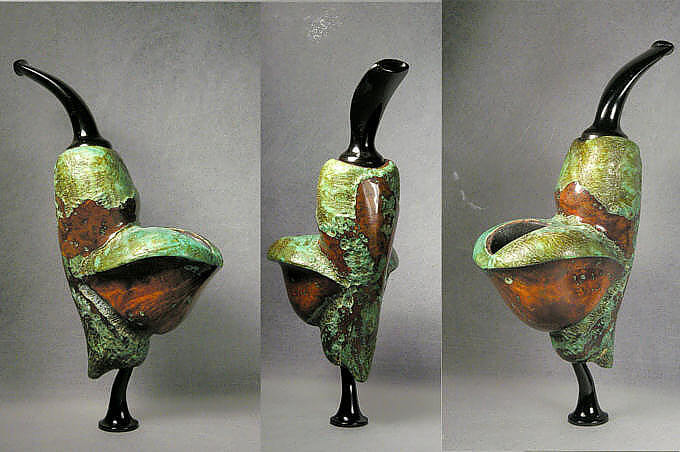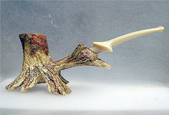 Christian précise que son travail est basé sur le bois, qu'il travaille avec, mais pas contre. Simplement, cela l'aide à en rendre visible la nature organique. Il part d'une idée précise, de ce qu'il peut observer dans la nature, fait des esquisses, puis trouve la pièce de bruyère adéquate, y reporte un croquis, puis passe aux étapes habituelles : sciage, forage, travail à la Dremel, râpage, ponçage, puis le travail de finition.