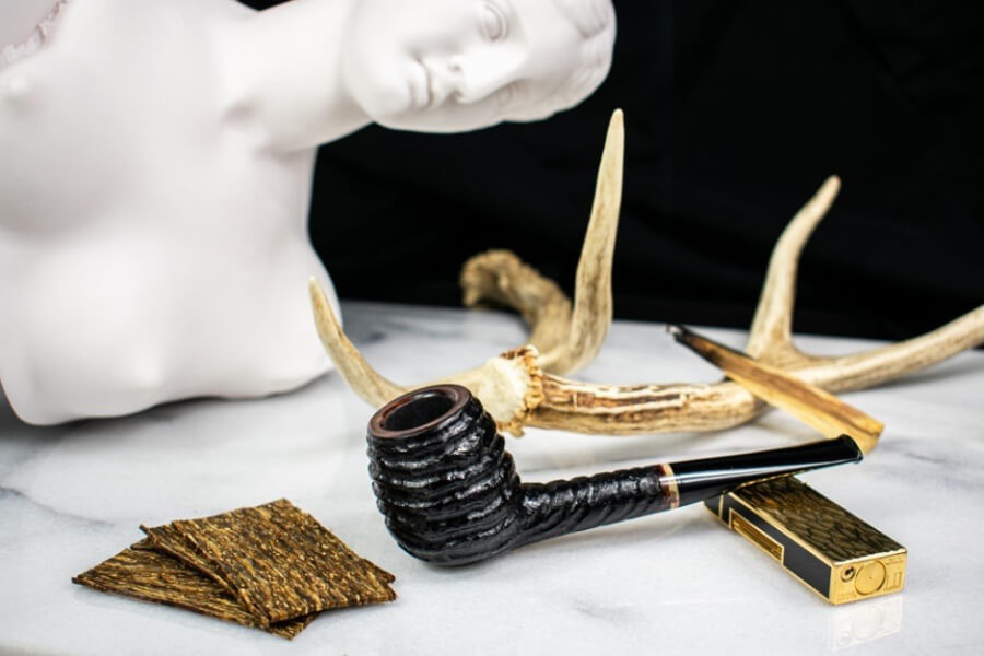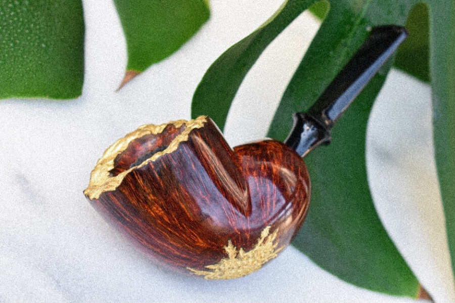 Sa bruyère vient principalement de Mimmo ou Manno, qu’il laisse reposer pendant six mois à deux ans, au gré de leur fraicheur. Ses tuyaux sont en ébonite de chez SEM ou NYH, traditionnellement noir, ou cumberland. Mais il propose également des tuyaux en acrylique ou en ébonite de couleur, de temps à autre, pour d’autres effets. Pour ses décorations, les matériaux naturels prévalent: bois exotiques, os et cornes d’animaux, pierres précieuses, métaux, etc.