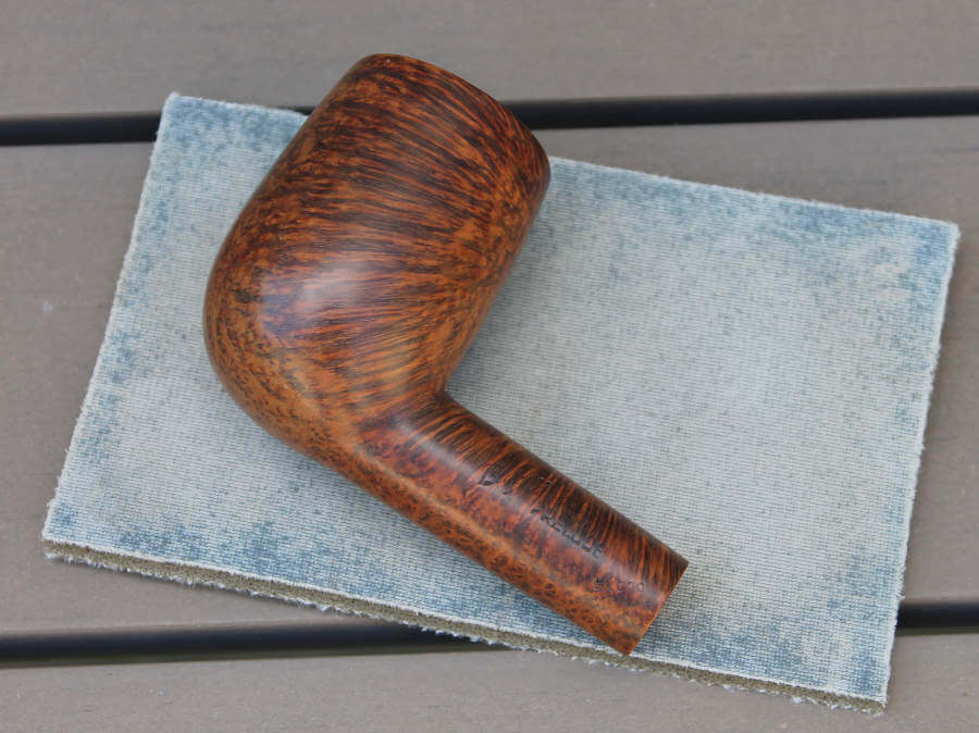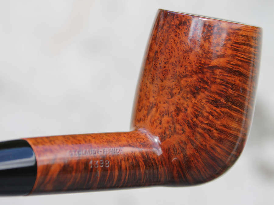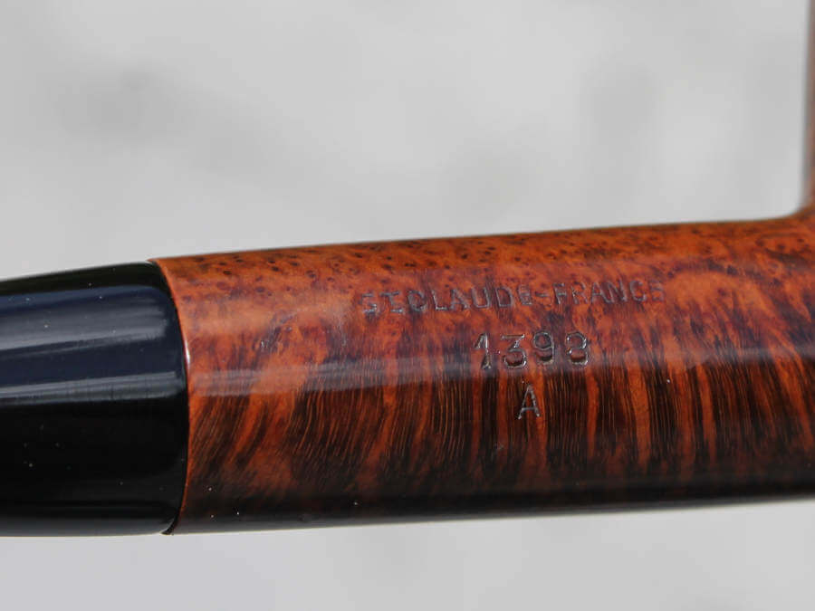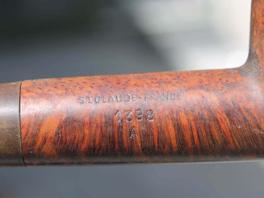 Le numéro de forme sur le côté droit de la tige indique 1398. Au-dessus, on peut lire ST CLAUDE - FRANCE. Enfin, sous le numéro de forme se trouve un A. Je ne peux que spéculer sur ce A solitaire, mais comme cette pipe est clairement haut de gamme, je soupçonne qu'il indique justement cela.
