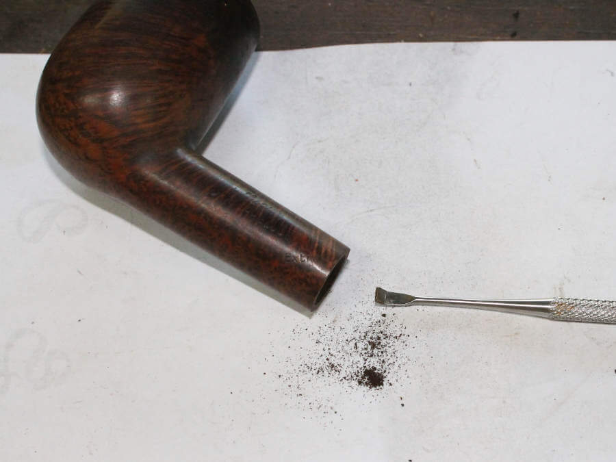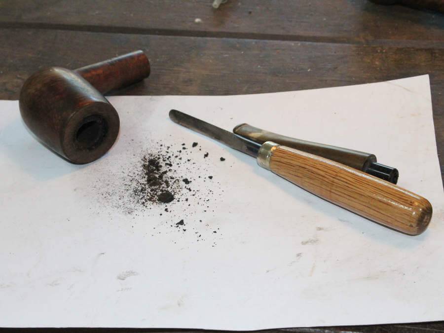 Le fourneau est toujours le premier sur ma liste. Si le fourneau s'avère être trop endommagé pour justifier une restauration complète, pourquoi ferais-je quand même un effort sur le tuyau ? Je commence par prendre mon propre couteau à aléser et je gratte soigneusement le bord supérieur du bol. Il y a beaucoup de carbone qui s'en détache.