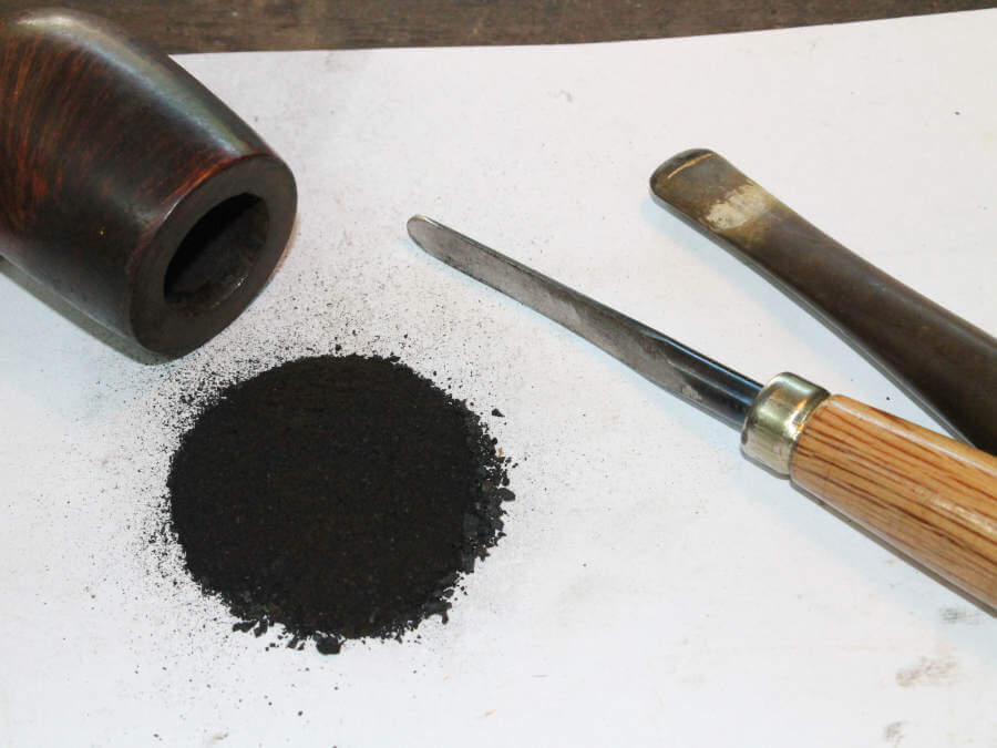 Maintenant la partie la plus intimidante : s'attaquer au culot très épais dans le fourneau. Cela m'a pris environ une heure, en grattant soigneusement tout ce tabac carbonisé jusqu'à ce que la bruyère redevienne visible. Je possède les outils d'alésage courants, mais je ne les utilise presque plus. Mon propre outil s'avère être l'alésoir parfait. La photo illustre à peine la quantité de gâteau de carbone qui est sorti du bol. Cette montagne était presque aussi haute qu'elle est large !