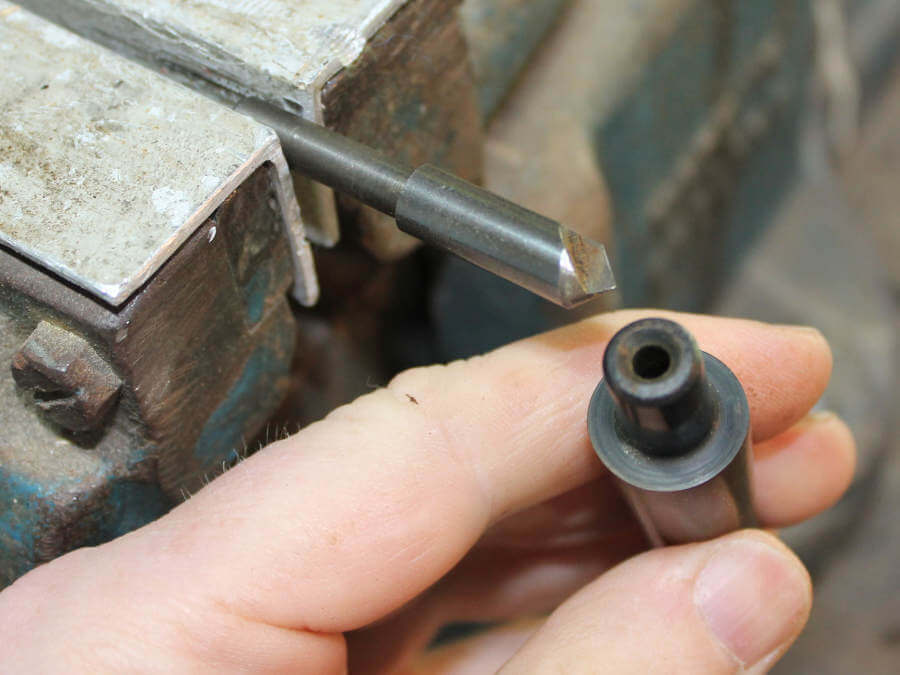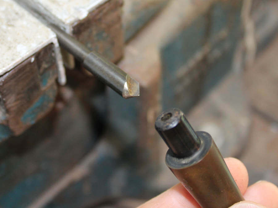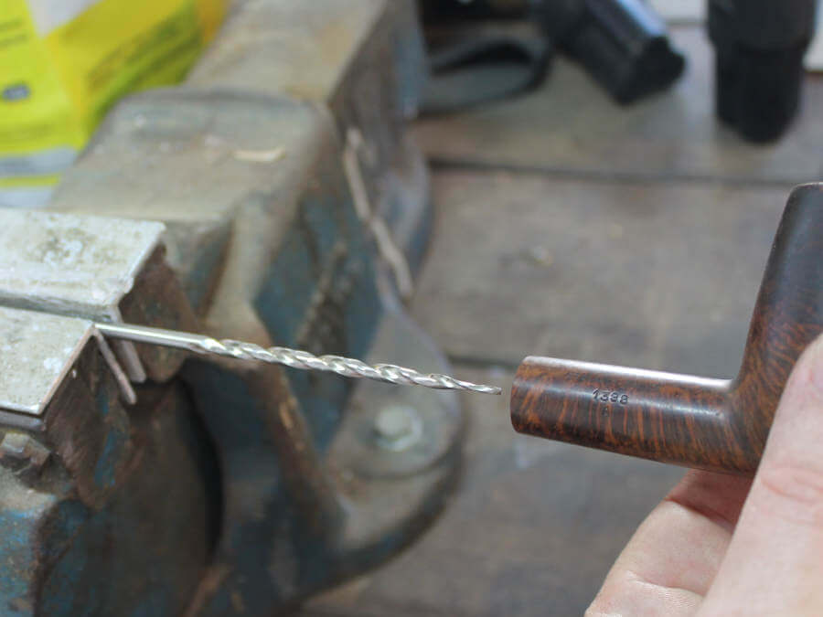 D'abord celui avec la pointe conique. Je serre la mèche dans mon étau d'établi, puis je tourne délicatement le bol à la main. N'utilisez jamais une perceuse électrique pour cela. La mèche conique est idéale pour trouver le chemin à travers un éventuel bouchon à l'intérieur du trou de tirage. Si la mèche droite était utilisée avant la mèche conique, l'obstruction pourrait diriger la mèche droite vers la bruyère.