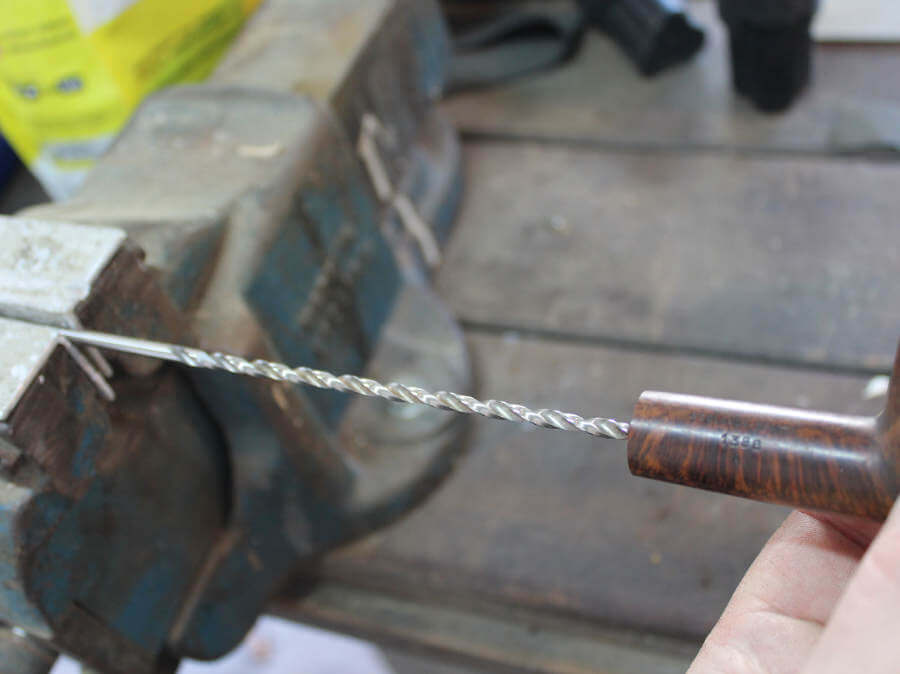 À partir de là, j'ouvre toujours le trou de tirage. J'aime que mes pipes aient un trou de tirage de 4mm. La plupart des pipes BC sont percées à 4mm, mais comme cette pipe a été si longuement fumée, il doit y avoir beaucoup de goudron à l'intérieur. Percer ces goudrons avant de poursuivre le nettoyage est très utile. J'ai deux mèches pour cela. L'un a une pointe effilée, tandis que l'autre est un foret droit standard, bien que très long, de 4mm.