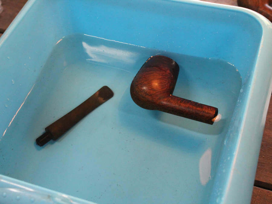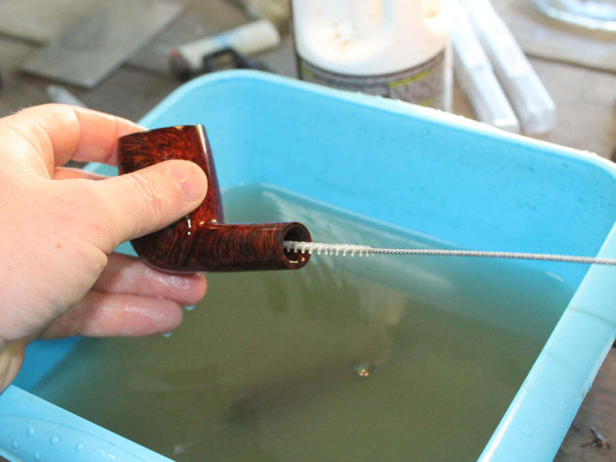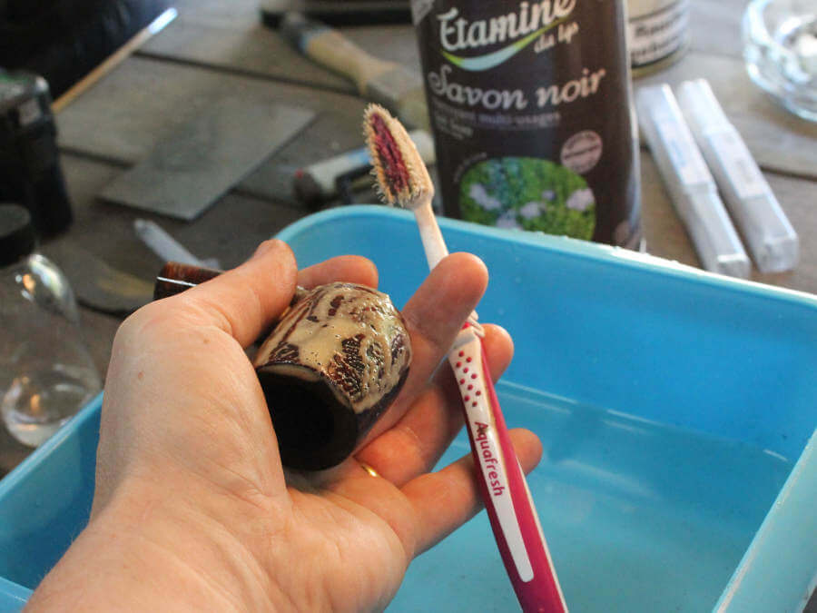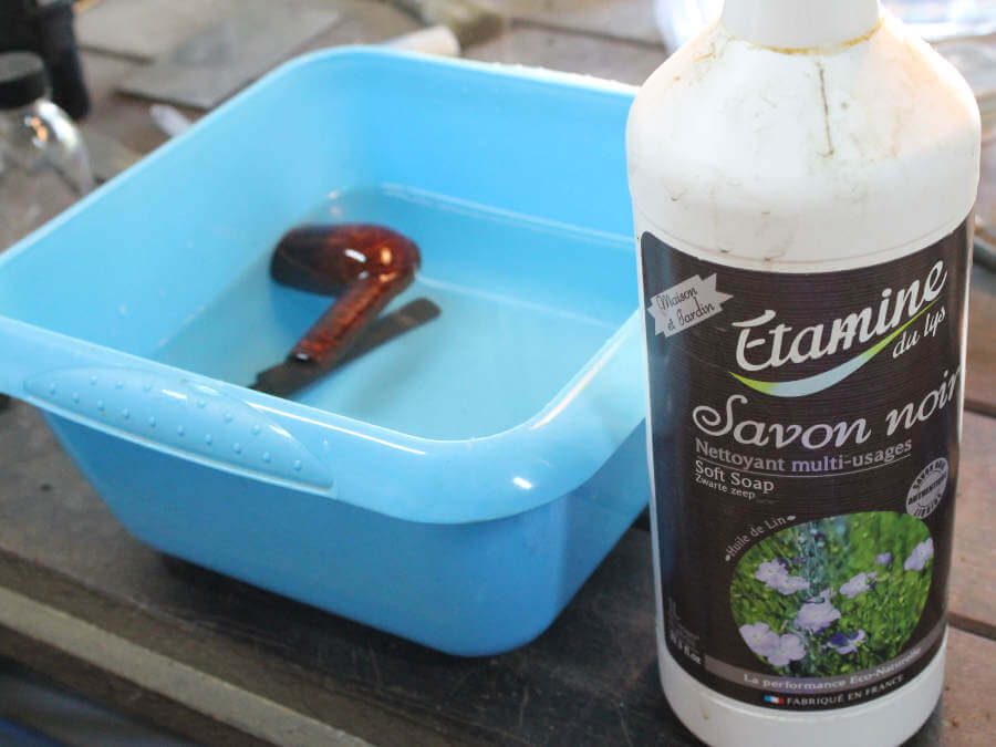 Ensuite, le bol et la tige vont dans l'eau. J'utilise un savon noir à base d'huile pour nettoyer la tête et la tige de l'intérieur vers l'extérieur. Quelques gouttes de savon sur le bol et la tige, puis une vieille brosse à dents et quelques efforts pour nettoyer les deux parties.