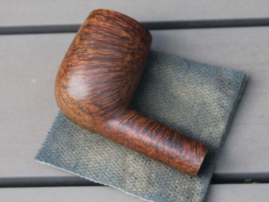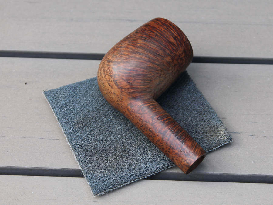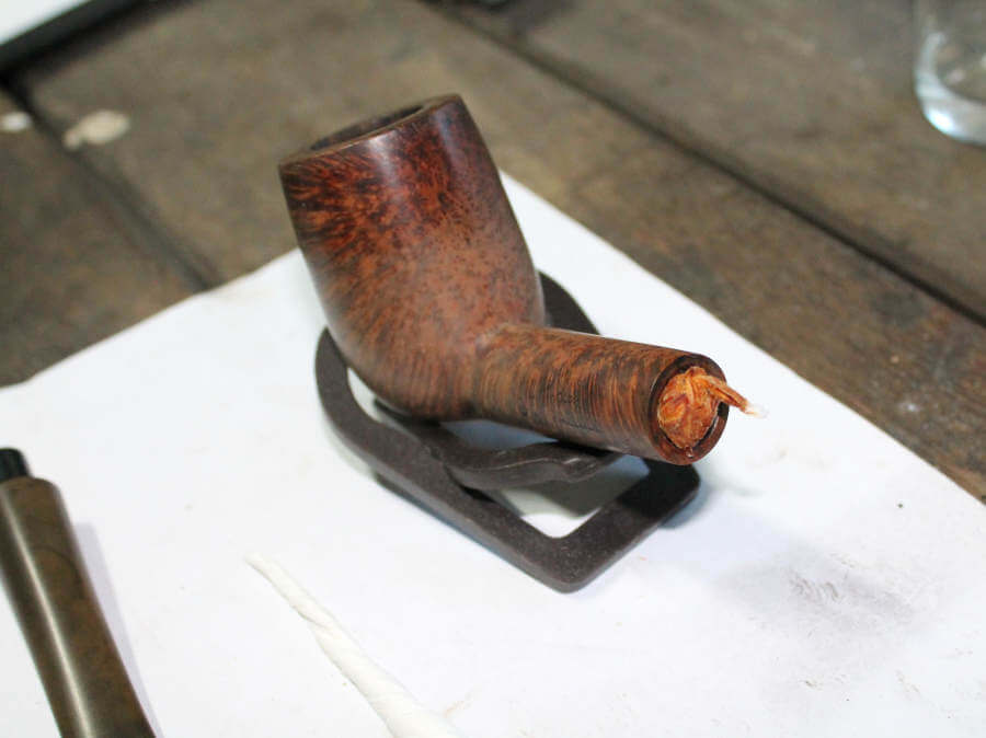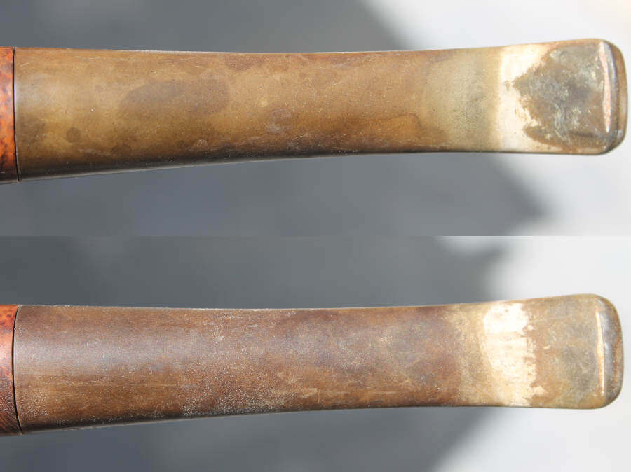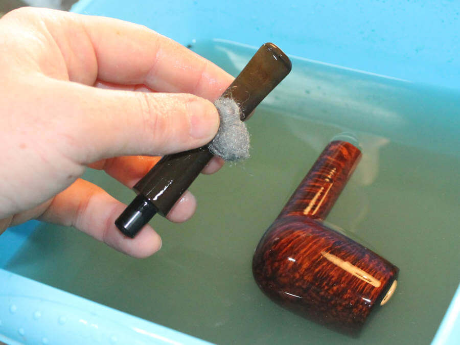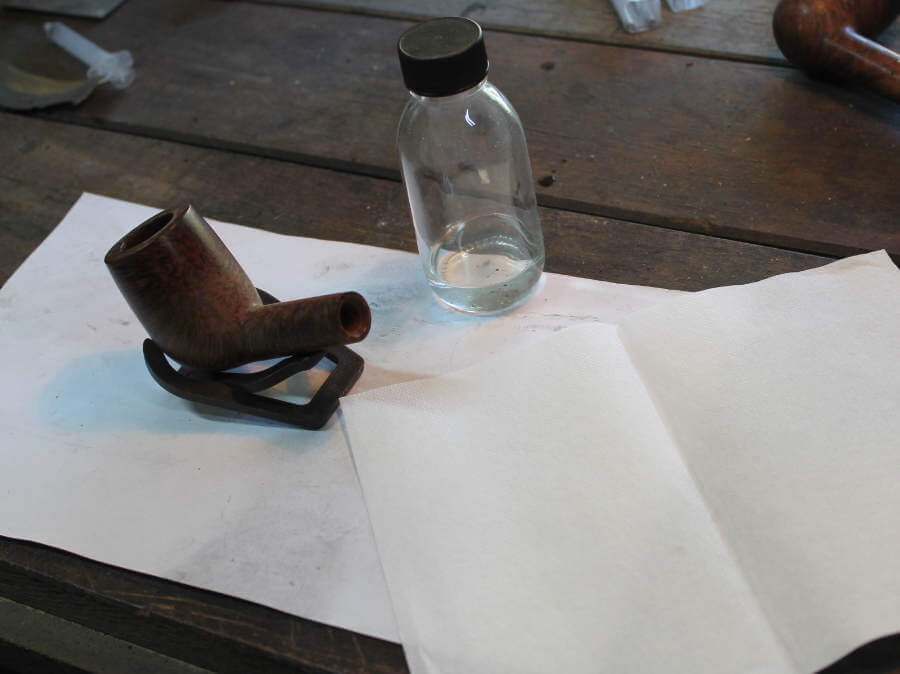 Un morceau de laine d'acier très fine est utilisé pour enlever les derniers restes de carbone sur le bord supérieur du bol. Par chance, il s'est avéré que le propriétaire précédent n'a pas frappé ses pipes sur des surfaces dures pour enlever les cendres et la crasse.