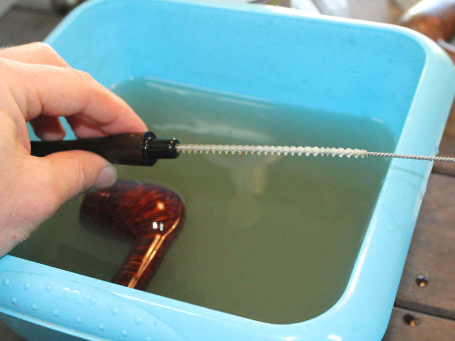 Pour terminer la partie humide du nettoyage, j'ai quelques brosses à poils fins et ronds en plastique. Je les utilise pour nettoyer grossièrement l'intérieur de la tige et du tuyau. Cela facilitera le processus de nettoyage en profondeur plus tard, car l'eau aura déjà ramolli un peu les goudrons.