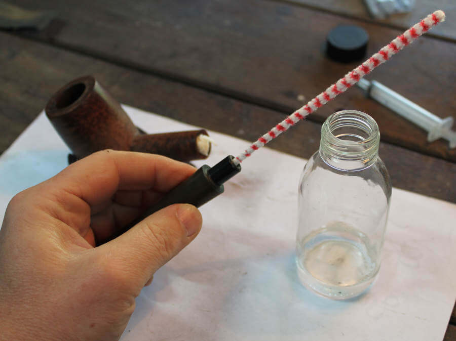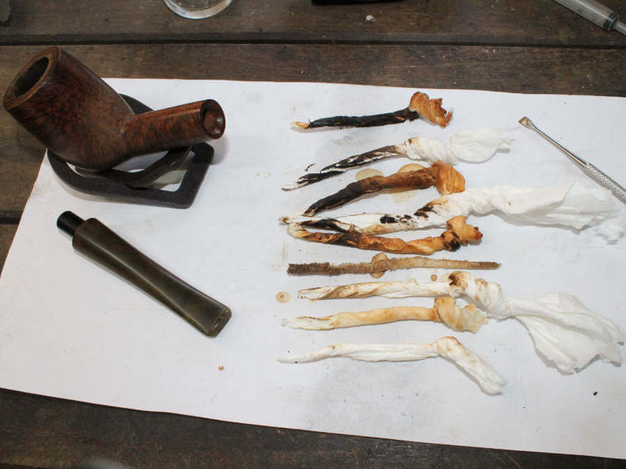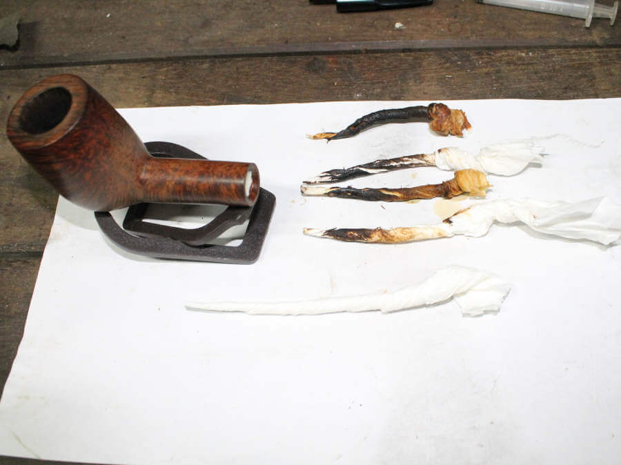 Cela continue jusqu'à ce que la mèche sorte nette. Avec cette pipe, j'ai dû faire quatre trempages complets dans l'alcool de trois heures. Cela signifie huit mèches au total, dont la mèche du bas montre qu'elle est sortie propre.