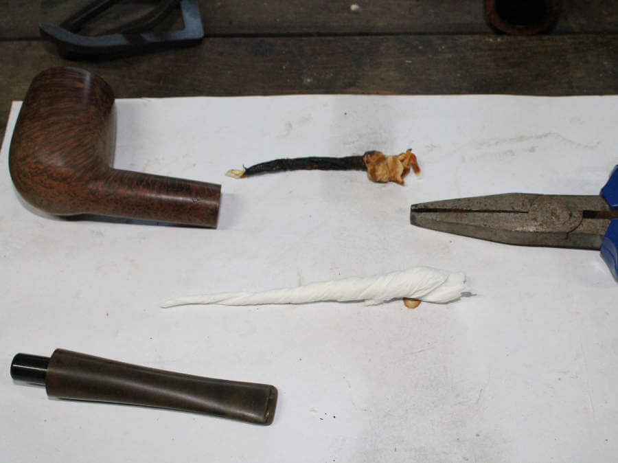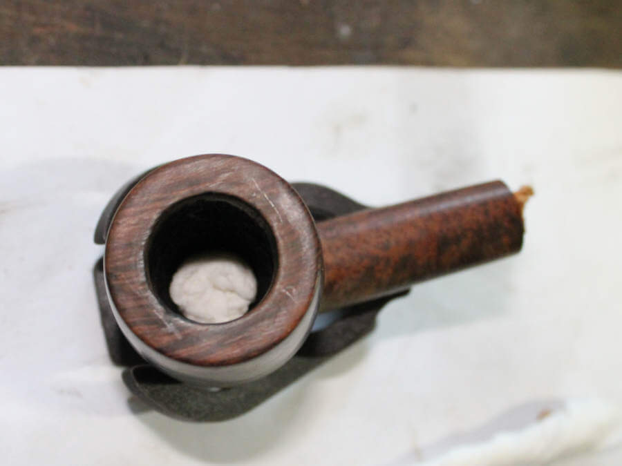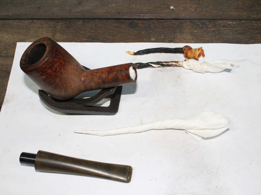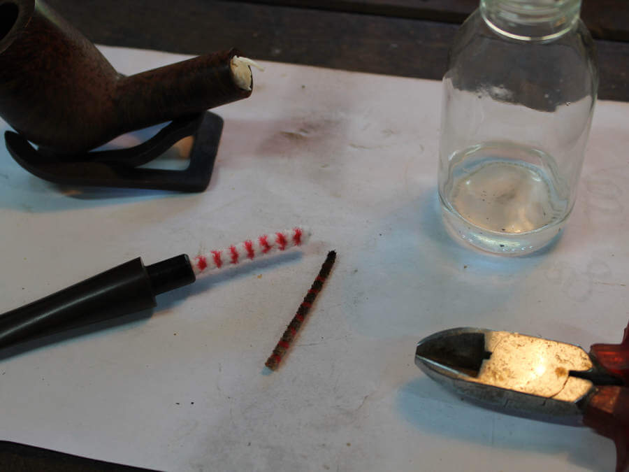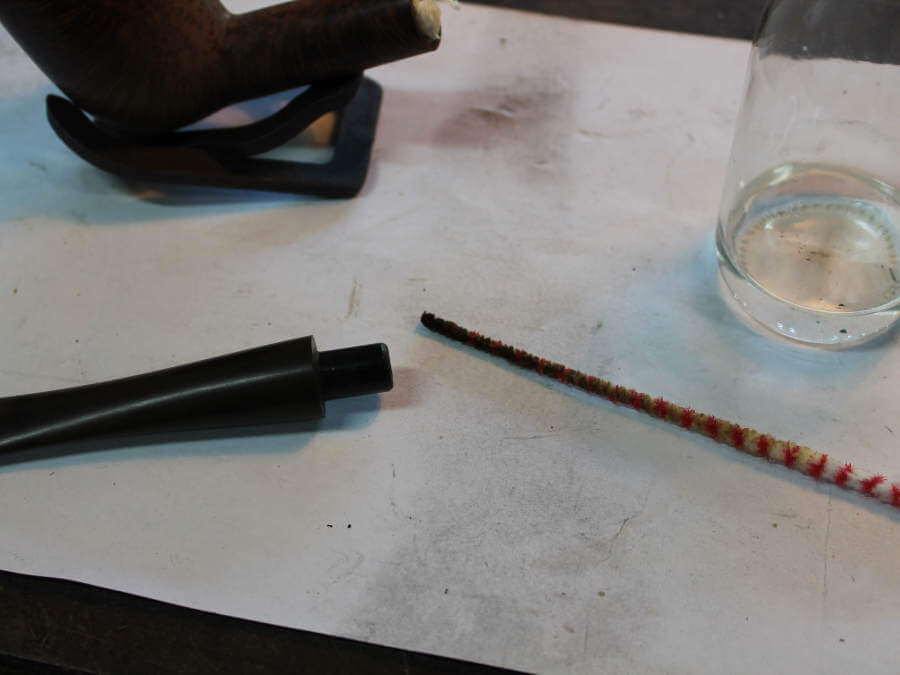 J'ai ensuite coupé la partie noire du cure-pipe, j'ai trempé le reste dans de l'alcool et l'ai à nouveau introduit dans la tige. Il est alors sorti beaucoup plus propre. Il est temps de terminer avec la chenillette douce. Elle est ressorti propre ! C'est assez étonnant par rapport à l'état de la pipe. Je suppose que le propriétaire précédent a au moins utilisé des cure-pipes de temps en temps.