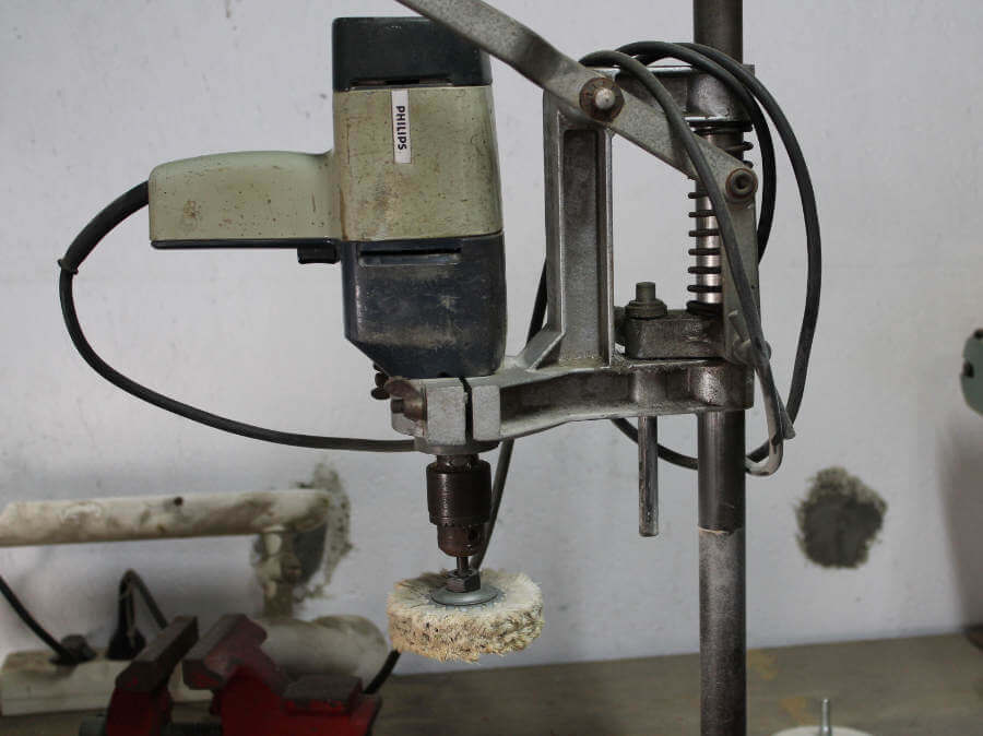 Je passe ensuite à la polisseuse. Je n'ai pas besoin d'une station de polissage semi-professionnelle avec de grandes roues en coton et des vitesses variables. Ce serait bien, mais un peu excessif pour mes besoins. Cette vieille perceuse Philips fera donc l'affaire. Une petite roue en coton est installée et la pâte à polir Diamond blanche polit le tuyau pour le faire briller.