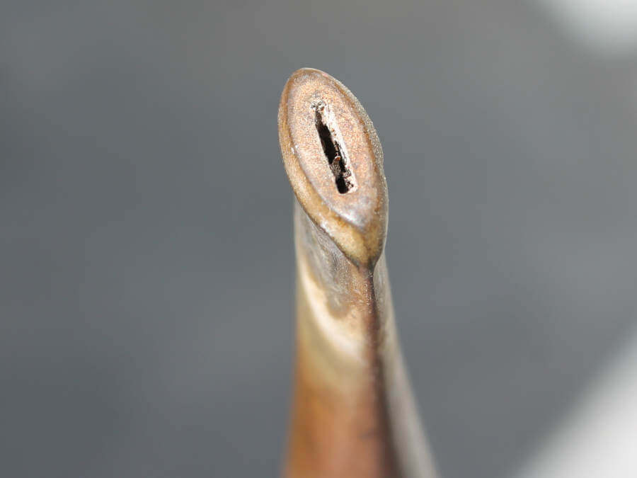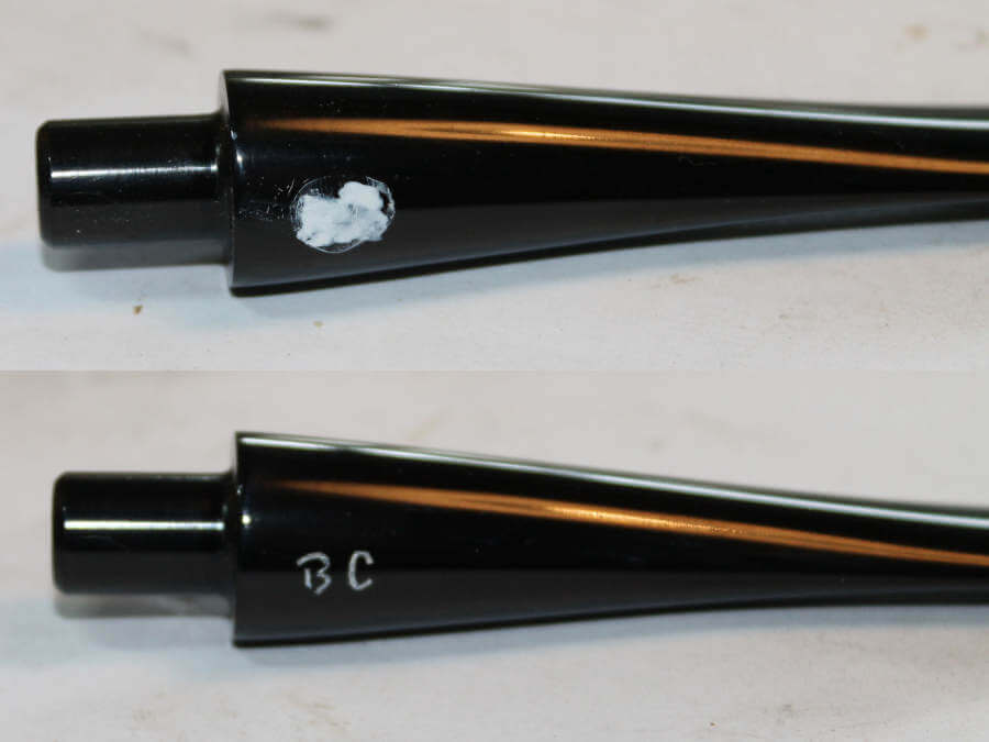 Il est temps de restaurer les deux lettres BC sur la tige. Je peins la zone avec précaution et laisse la peinture durcir complètement avant de poursuivre. Le BC est finalement sorti de la restauration de manière tout à fait satisfaisante. Ensuite, j'huile la tige avec de l'huile minérale et je la laisse reposer quelques heures avant de la polir à la main avec un chiffon en microfibre.