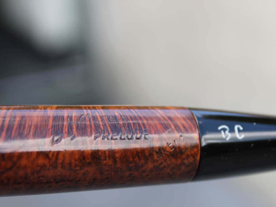 Les marquages sur cette pipe sont tout à fait standard pour une Butz-Choquin. Sur le côté gauche de la tige se trouve le logo Butz-Choquin courbé standard. Juste en dessous de ce logo, le nom de la série apparaît en majuscules : PRELUDE. Et puis, dans le coin inférieur droit, on trouve le mot Extra en angle. Ce cachet Extra indique que le bois de cette pipe ne présente aucun défaut et qu'il n'y a pas de mastic. C'est ce qui m'a poussé à acheter cette pipe malgré son état déplorable.