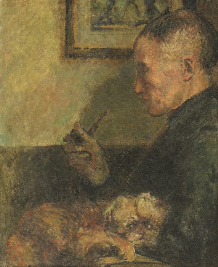 homme assis avec sa pipe et son chien