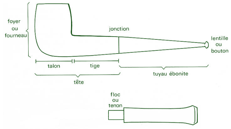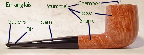 Vous trouverez ci-dessous deux images, vous donnant les mots anglais et français utilisés pour les différentes parties d'une pipe. Pour les termes anglais, l'image vient du site de Trever Talbert.